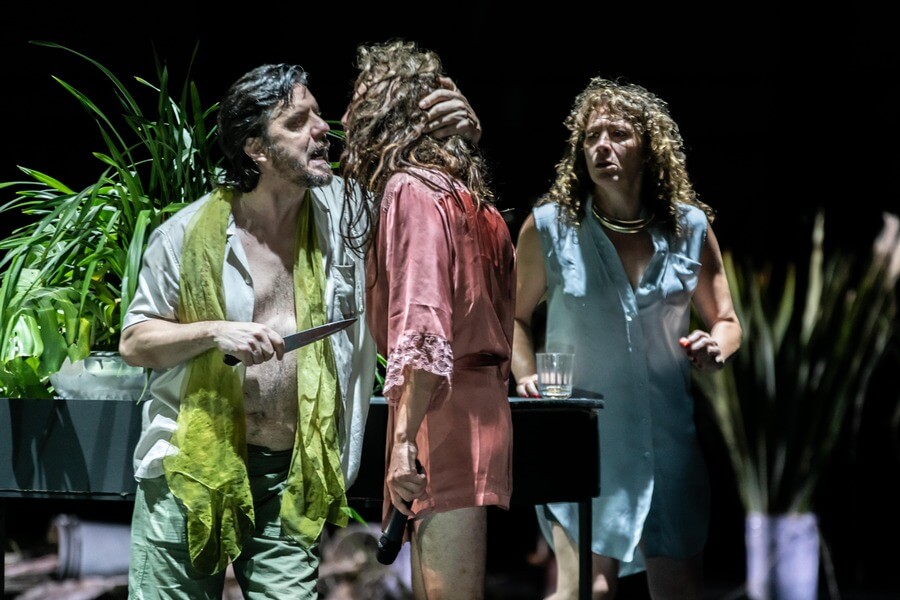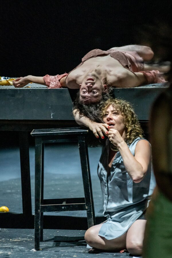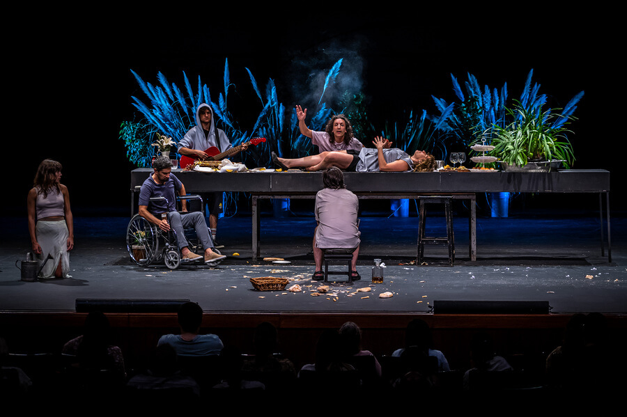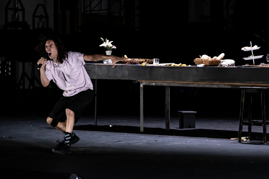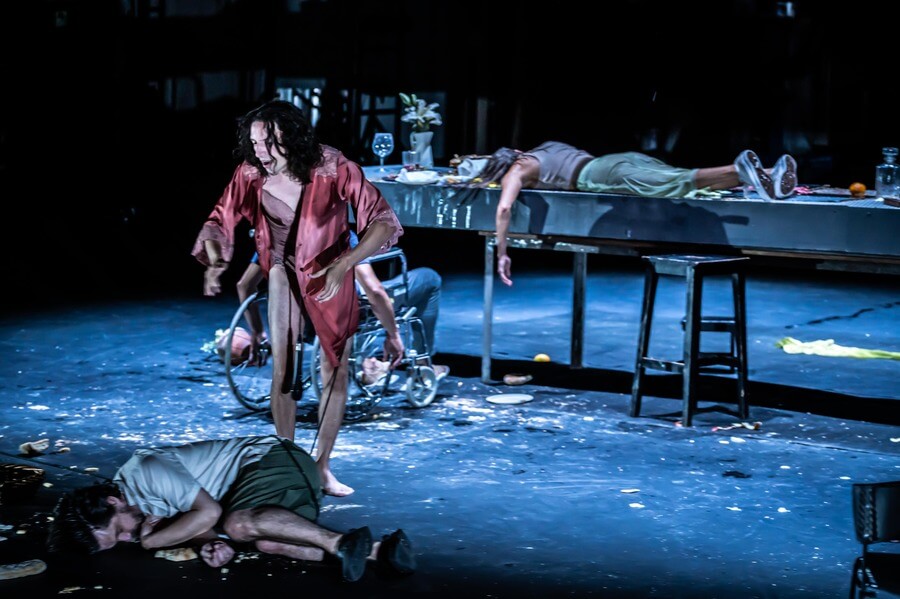 La escena se abre con un banquete cuidadosamente dispuesto: una mesa impecable, cargada de promesas de orden, celebración y jerarquía. Este espacio, en apariencia doméstico, es en realidad el núcleo de una corte corroída por el secreto, la ambición y el duelo no resuelto. A medida que avanza la acción, la mesa se va descomponiendo, como si absorbiera el colapso de los vínculos que la rodean. La comida, manipulada, derramada, pisoteada, deja de ser alimento y pasa a ser residuo: se transforma en una materia simbólica que revela lo que se pudre por dentro.