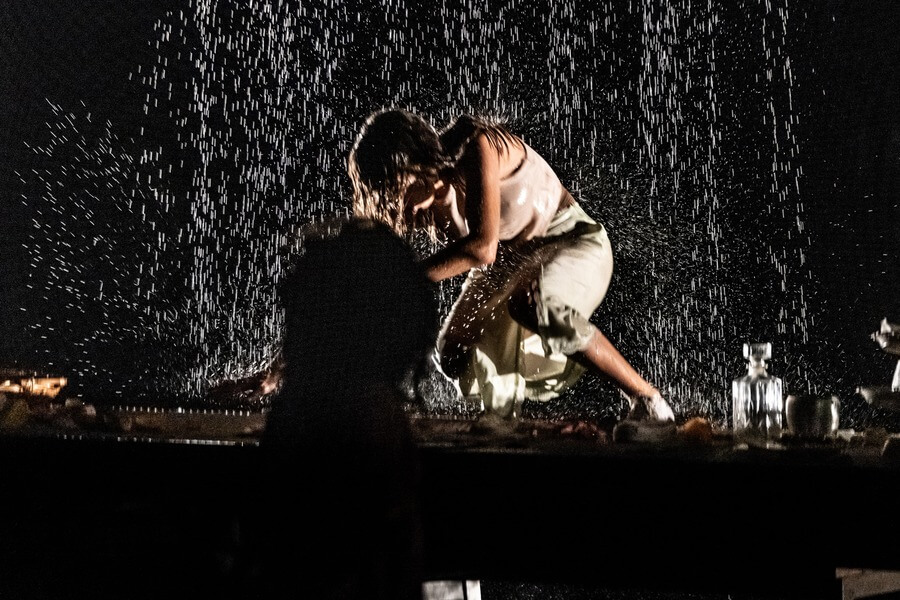 Este deterioro se materializa en una imagen culminante: una catarata de agua cae sobre la mesa, inundándola junto a los restos del banquete. El agua arrastra consigo la mugre generada en escena —una mezcla de alimentos, cuerpos, palabras y gestos— y expone la podredumbre emocional y moral que se había mantenido apenas contenida bajo la superficie. Lo físico y lo simbólico se funden en esta imagen final, donde lo que cae no es solo agua, sino todo lo que ya no puede sostenerse.